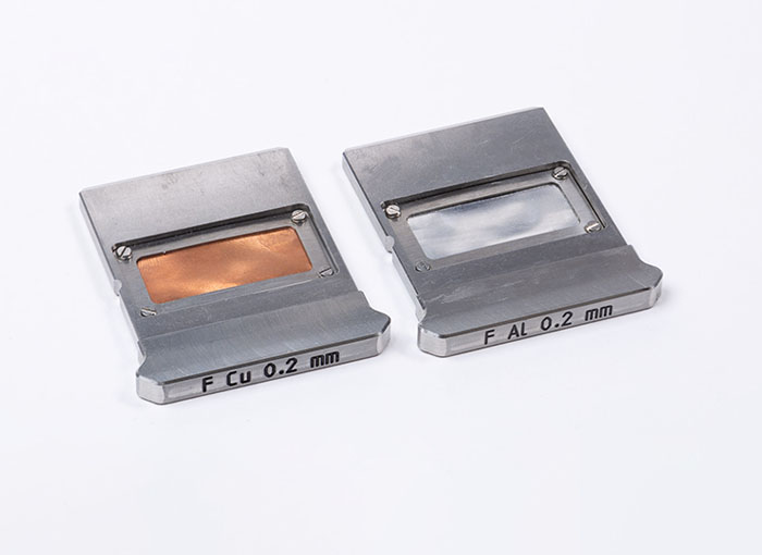 Los atenuadores con lámina de cobre o aluminio de diferentes espesores se pueden insertar en el zócalo del filtro para limitar la intensidad del haz durante la alineación.